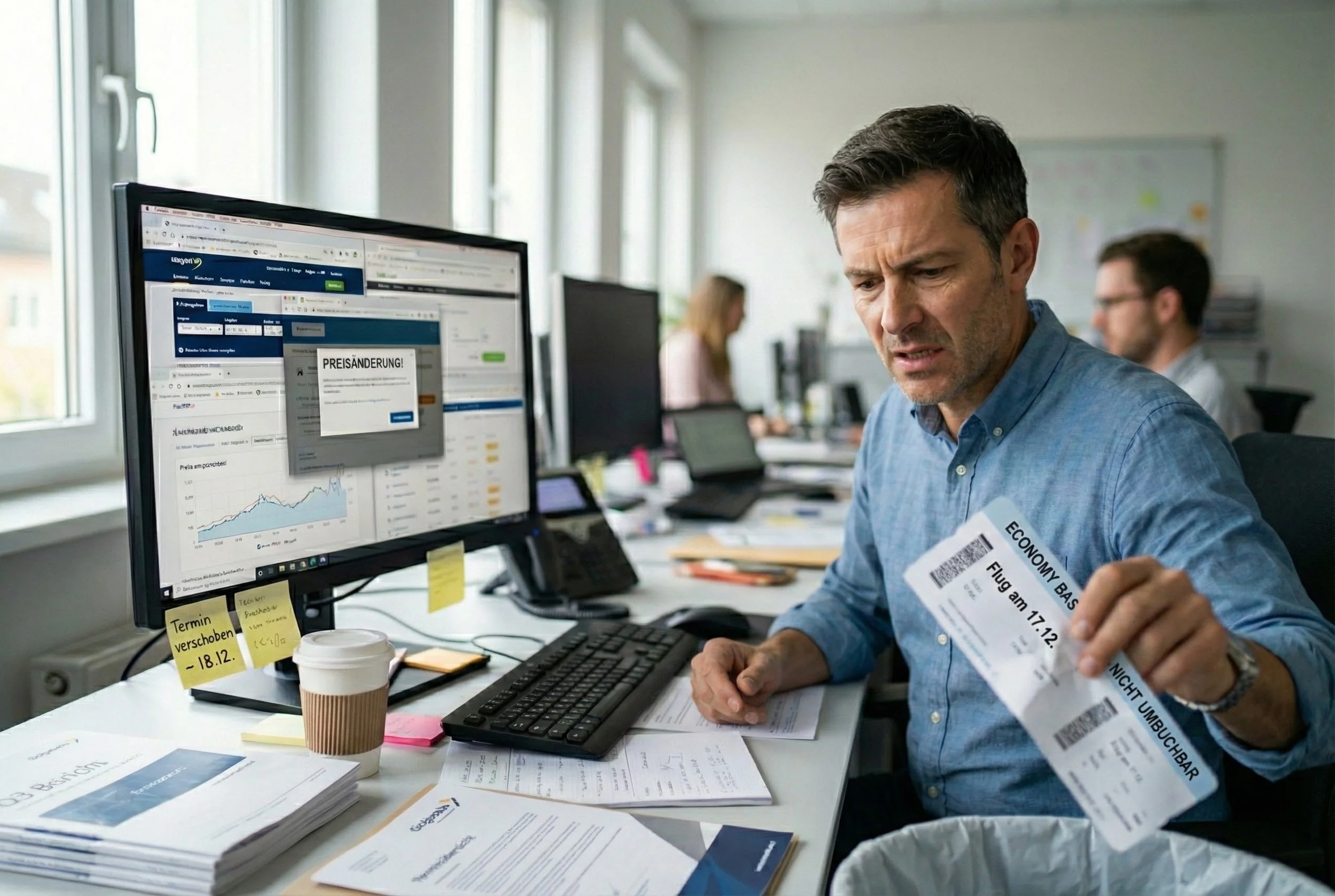 Der "Superspar-Tarif" aus dem Portal lässt sich in diesen Fällen oft gar nicht oder nur gegen den Neupreis umbuchen. Wenn der Termin platzt, sind 100 % des Ticket- und Hotelpreises verloren.