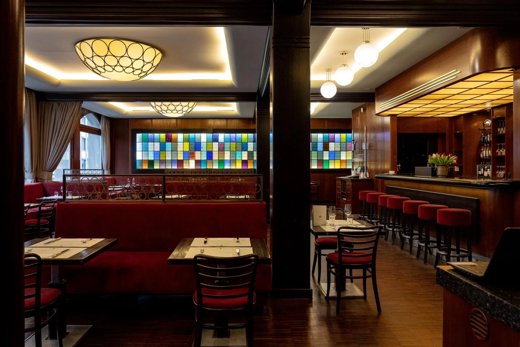 Neben dem Saal bietet das Café Paris zwei weitere Räume für unterschiedliche Anlässe: Die Bel Etage im ersten Stock verbindet moderne und traditionelle Elemente – dunkle Farben, eine antike bunte Glaswand und ein exklusiver Barbereich schaffen eine ruhigere, elegante Atmosphäre für bis zu 85 Gäste, ideal für reservierte Business-Frühstücke oder Firmenfeiern.